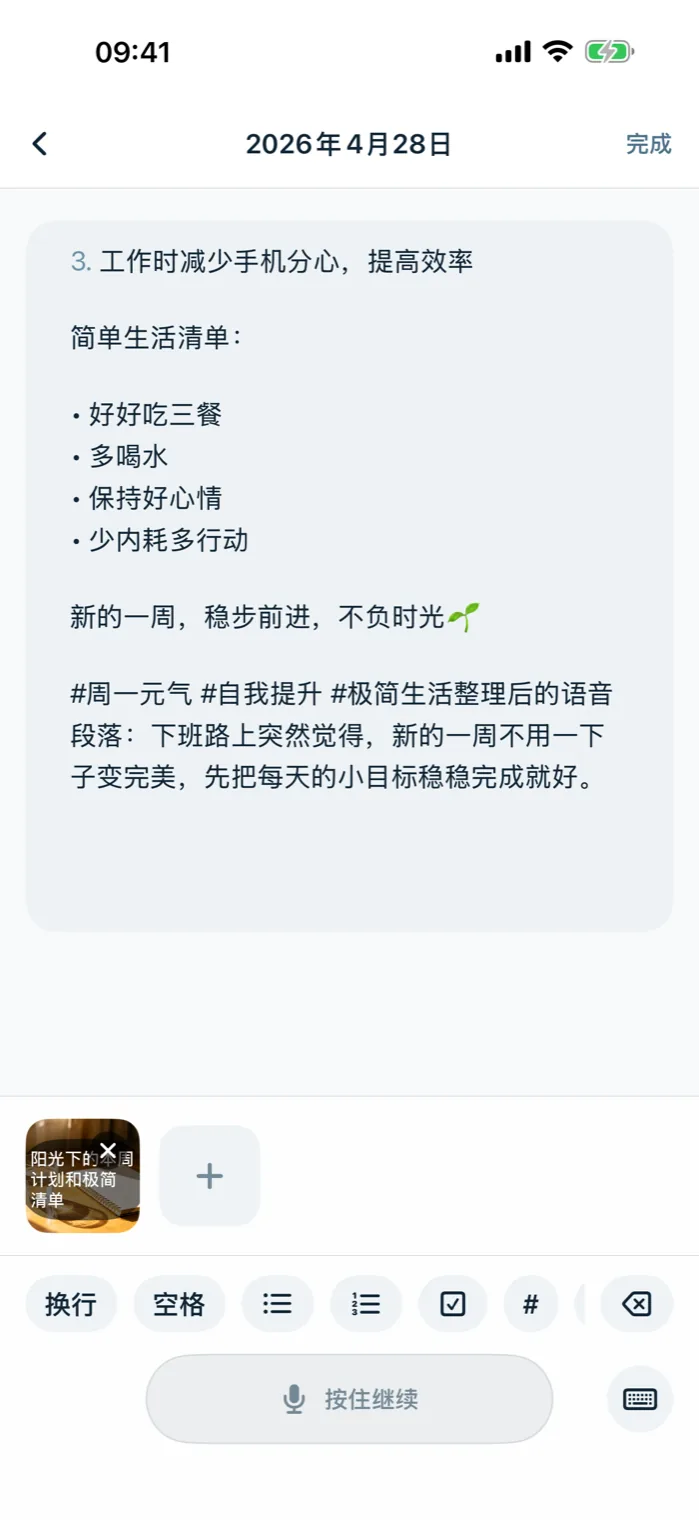 把日常片段直接说出来,Lockeep 会在本机整理成可回看的文字草稿。